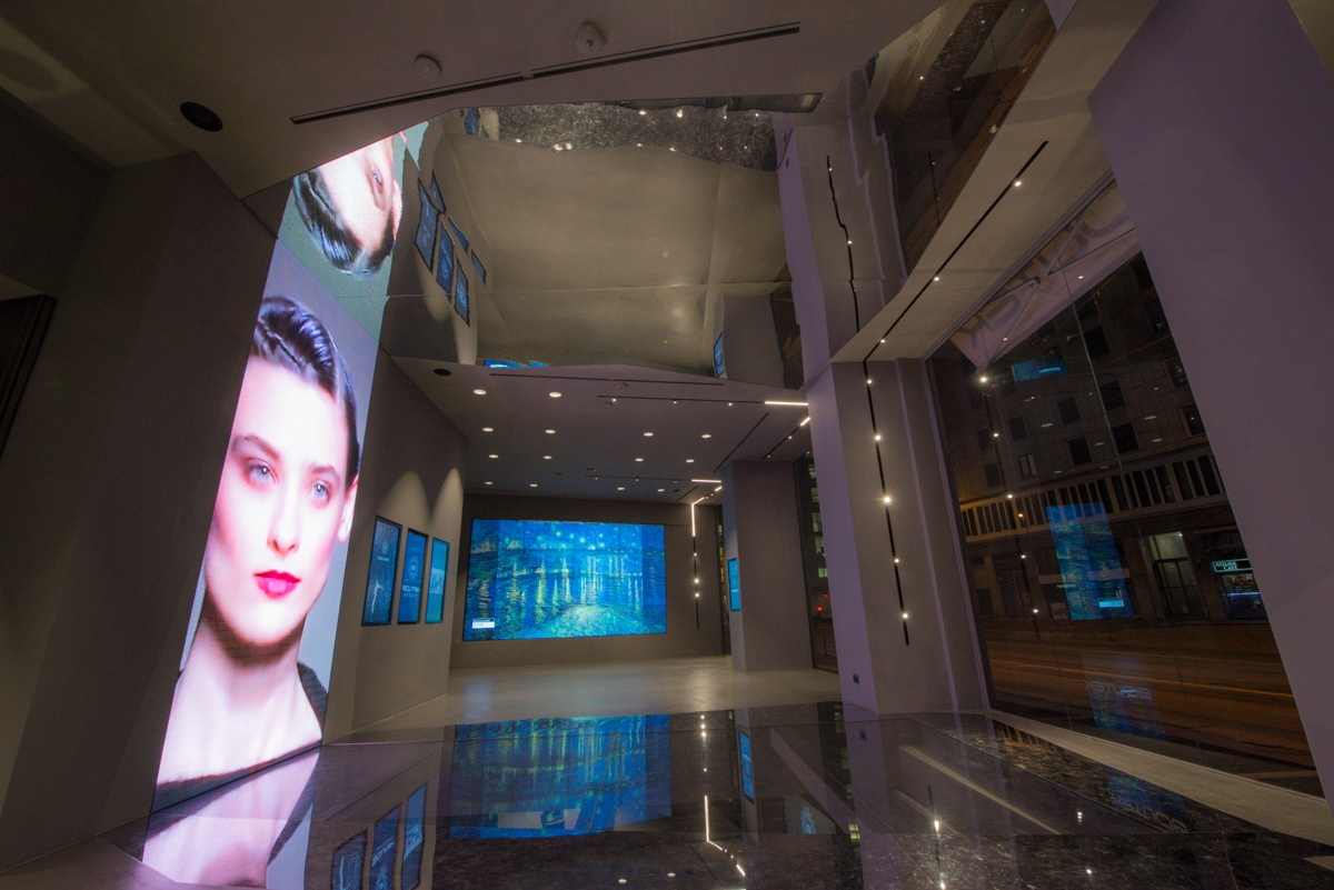 Al piano terra oltre ai vari video da 40” e 48” pollici con funzionalità touch e touchless sui quali è possibile caricare immagini, presentazioni, creare interazioni internet ecc., sono presenti 2 grandi superfici luminose, 1 a Led ,circa 7,5ml di altezza e un videowall 4k di 220” appositamente studiati per catturare l’interesse del pubblico.